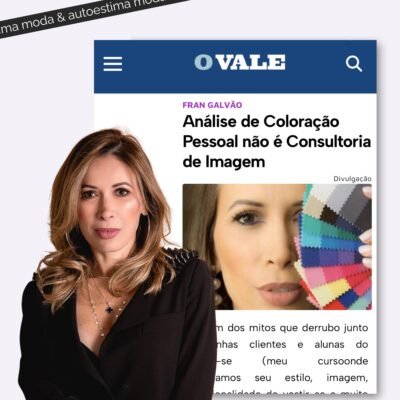 Leia maisColuna publicada Jornal O Vale em 16 de novembro 2024 https://sampi.net.br/ovale/noticias/2868148/fran-galvao/2024/11/analise-de-coloracao-pessoal-nao-e-consultoria-de-imagem Análise de Coloração Pessoal não é Consultoria de Imagem. Um dos mitos que derrubo junto as minhas clientes e alunas do Estilize-se (meu curso onde trabalhamos seu estilo, imagem, intencionalidade do vestir-se e muito mais) é o tal do “todo mundo fica […]