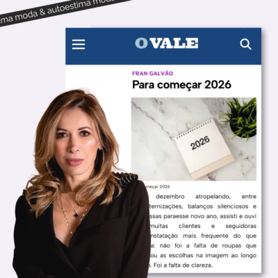 Coluna publicada Jornal O Vale em 03 de janeiro 2025 Leia a coluna completa Pra começar 2026… Com dezembro atropelando, entre confraternizações, balanços silenciosos e promessas para esse novo ano, assisti e ouvi de muitas clientes e seguidoras uma constatação mais frequente do que gostaria: não foi a falta de roupas que dificultou […]